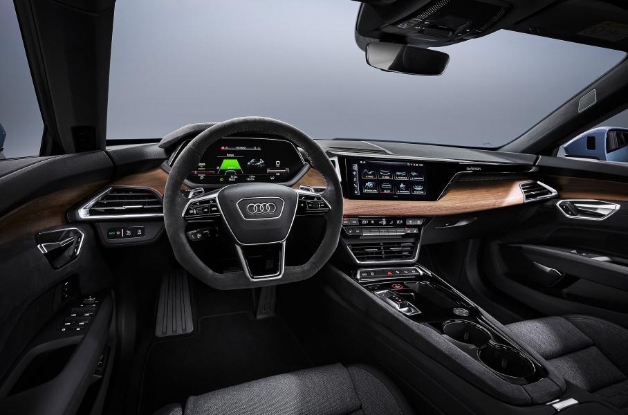 В салоне e-tron GT установлены два экрана: 12,3-дюймовая виртуальная панель приборов и 10,1-дюймовый дисплей мультимедийной системы, причем они разделены на два отдельных кластера. Отличия от концепта, как и в экстерьере, точечные: например, дефлекторы воздуховодов имеют другую форму. В целом же оформление интерьера e-tron GT задает направление для будущих моделей Audi. Обивка сидений может быть выполнена из комбинации кожзама и материала Kaskade, полученного после переработки пластиковых бутылок и старого текстиля и похожего на шерсть; кожзама и микрофибры Dinamica или двух видов натуральной кожи.