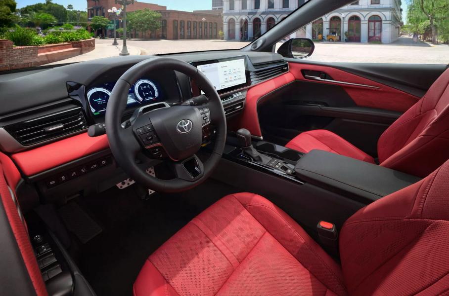 Салон Camry девятого поколения совсем другой: изменилась передняя панель, руль, центральный тоннель и сиденья! В базовую комплектацию входит виртуальная приборная панель (семь дюймов) и медиасистема с 8-дюймовым тачскрином, но такие сборки (SE и LE) не показали. На фотографиях только «топовые» варианты с парой 12,3-дюймовых экранов. Тачскрин больше не парящий, остался в прошлом блок управления климатом с функциональными шайбами, избавились от асимметричного подлокотника.