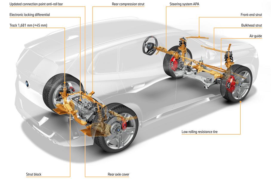 В BMW обещают, что по характеру X3 нового поколения — самый спортивный в истории модели. На это работает изменённая кинематика подвески с увеличенной колеей (+16 мм спереди и +45 мм сзади) и увеличенным развалом передних колёс; более жёсткие крепления рычагов передней подвески; «короткая» рейка; жёсткие стойки стабилизаторов и их опоры; ряд хитростей с эластокинематикой подвески. А ещё усиленный кузов с целым набором распорок спереди и сзади. Стабильности на прямой способствует увеличенный на 19% кастор передних колёс. При всём при этом обещают и улучшенный уровень комфорта.