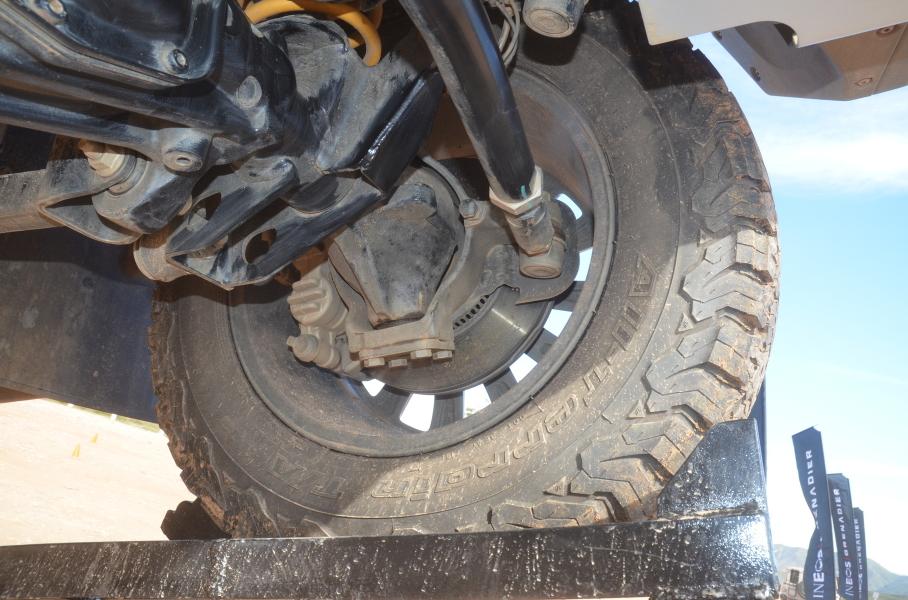 Штатно на Grenadier устанавливают высокопрофильные шины размерностью 265/70 R17 на стальных дисках, причём на версии Trialmaster это довольно «зубастая» резина BFGoodrich T/A K02. Опционально предлагаются более крупные колёса размерностью 255/70 R18. Их внешний диаметр составляет 31,6 и 32,1 дюйма соответственно. Не то чтобы мало, но любители путешествий по бездорожью предпочитают иметь хотя бы 33 дюйма. Впрочем, кое-кто из владельцев уже проверил: такие колёса встают на машину без переделок. Ну а чтобы приспособить 35-дюймовое колесо, понадобится небольшой лифт кузова.
