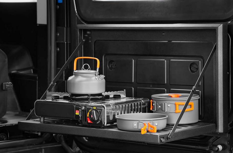 Рельсы на бортах позволяют во время стоянки удобно хранить разную походную утварь