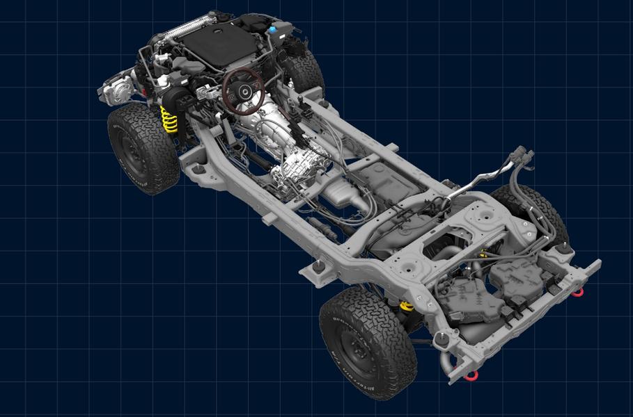 За три года внедорожник был сконструирован «от и до»: уже в 2020 году публике показали первые прототипы. Выглядит парадоксально: на выходе получилась очень консервативная конструкция, но выполненная по последнему слову техники. Впрочем, именно этого и хотел заказчик: Grenadier получил прочную лонжеронную раму из профилей замкнутого сечения, неразрезные мосты спереди и сзади — на пружинной подвеске с четырьмя рычагами и тягой Панара, плюс постоянный полный привод — с блокируемым межосевым дифференциалом и понижающей передачей.