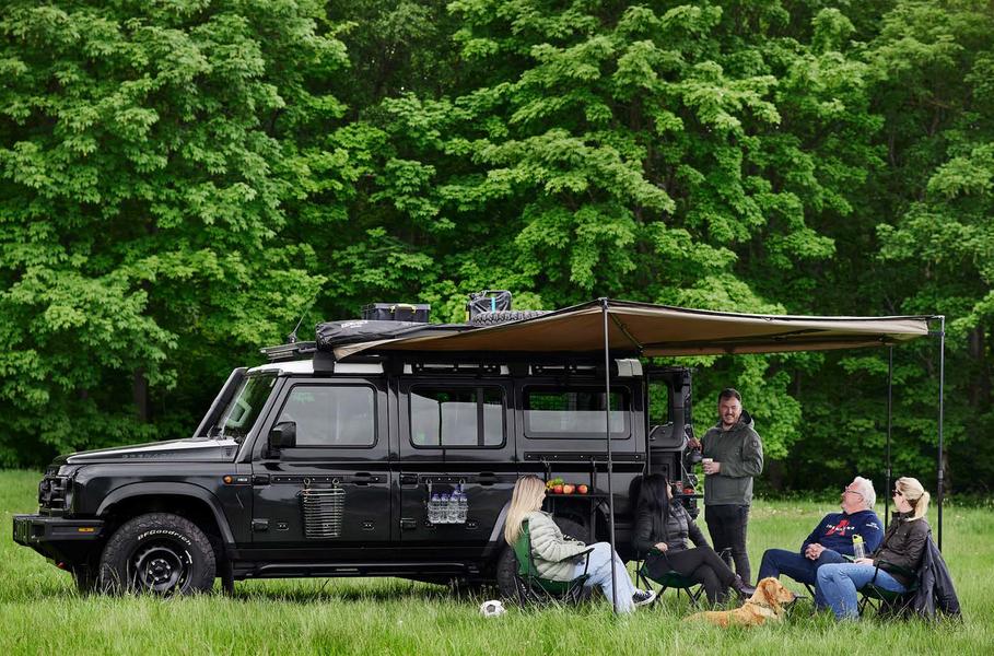 На внешнее сходство с Дефендером и указывать нет смысла. Кажется, главной задачей шеф-дизайнера Тоби Экуйера было создать ровно столько отличий от Дефендера, чтобы его не обвинили в плагиате: Land Rover в 2019 году даже судился с INEOS (правда, безрезультатно). А различий буквально наперечёт: иная компоновка головной оптики — с «противотуманками» в радиаторной решётке и без отдельных поворотников по бокам; горизонтальные вставки-держатели на бортах; отсутствие «альпийских окошек» на скатах крыши; проём задней двери во всю ширину задка и большие круглые фонари вместо россыпи маленьких.