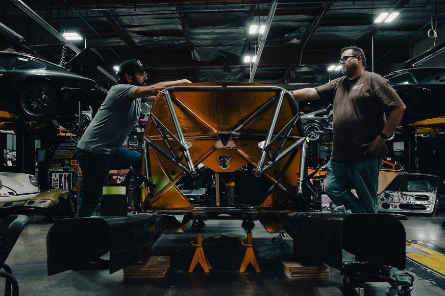 Здесь хорошо видно, что основа гоночного болида — сложная пространственная рама из стальных труб. Единственное, что осталось от серийного Porsche 911 — это панель крыши с рамкой лобового стекла.