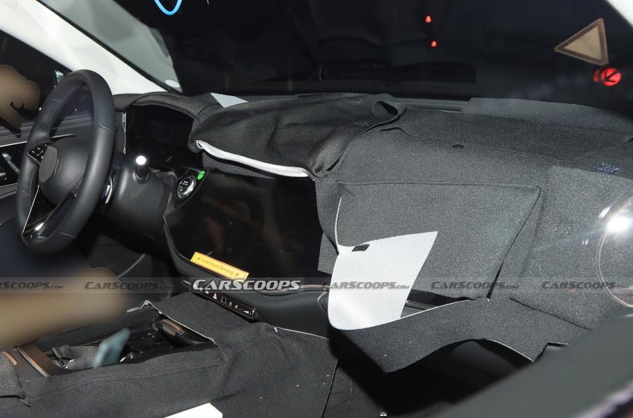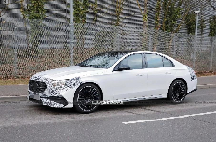 Судя по минимальному камуфляжу, до премьеры Mercedes-Benz E-Класса остались считанные недели. По традиции, в Штутгарте оформят экстерьер C-, E- и S-Class в едином ключе, а вот салон будет совсем другим: от схемы с портретно-ориентированным тачскрином отказались в пользу вытянутого по горизонтали дисплея. Из других новшеств — выдвижные дверные ручки и более аэродинамичные колёсные диски.