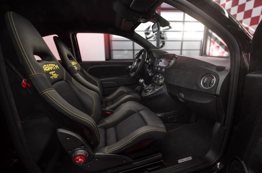 В салоне 695 75° Anniversario найдутся кресла Sabelt с каркасом из углепластика, обтянутая черной алькантарой передняя панель и мультимедиа с 7-дюймовым дисплеем. Стандартное оснащение хэтчбека включает поддержку Apple CarPlay и Android Auto, аудиосистему Beats Audio, навигацию и доступ к сервисам Mopar Connect, среди которых помощь на дороге, отслеживание местоположения, удаленная диагностика и планировщик маршрутов.