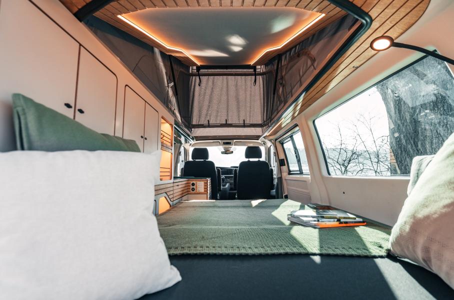 Всё это дополнено графикой на кузове в виде топографических контуров, навесом Thule Omnistor 4200 и креплением для велосипеда (оба входят в опциональное оснащение). Однако самое интересное — внутри. Салон кемпера отделан флокированным стеклопластиком, компакт-ламинатом, натуральным деревом и утеплен овечьей шерстью. Есть кухонный модуль с индукционной плитой, холодильник, система освещения с функцией диммирования, восемь портов USB и 230-вольтовая розетка. Особый шик — светильник KOOKOO MoriMori со встроенной Bluetooth-колонкой.