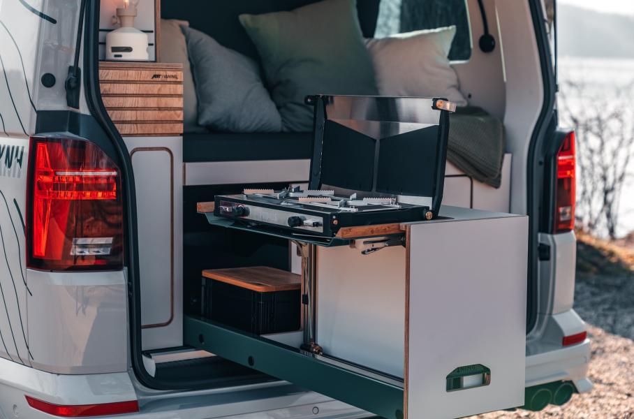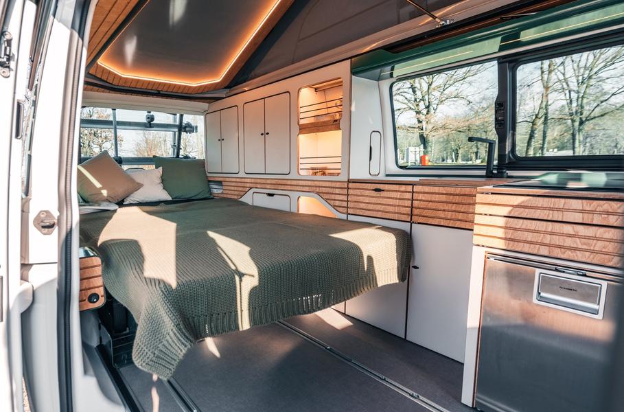 Поскольку здесь четыре спальных места, то путешествовать можно всей семьей. В ABT догадались установить даже лампу для чтения и шторки на окна с магнитным креплением для защиты от посторонних глаз. Если захочется перекусить на открытом воздухе, в задней части имеется выдвижной модуль с газовой плитой и ящиками для посуды. Там же находится отсек под длинномеры: солнечные зонтики или лыжи. Электричеством машину обеспечивают солнечные панели и генератор со встроенной LiFePO4-батареей емкостью 1900 ватт-часов. Что касается двигателя, то это дизель 2.0 мощность 150 лошадиных сил и 340 Нм крутящего момента.