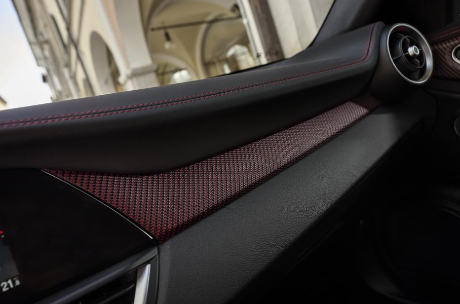 Для отделки салона впервые использовано колорированное углеволокно вперемежку с натуральной кожей и алькантарой. На передней панели установлена цифровая «приборка» диагональю 12,3 дюйма, которая предлагает выбор из трех тем оформления: современной Evolved Relax, винтажной Heritage, напоминающей о моделях Alfa Romeo 60−70-х годов прошлого века, и специальной Race. При активации последней на экране отображаются только тахометр, спидометр и, если выбран ручной режим автоматической коробки, индикатор переключения передач.