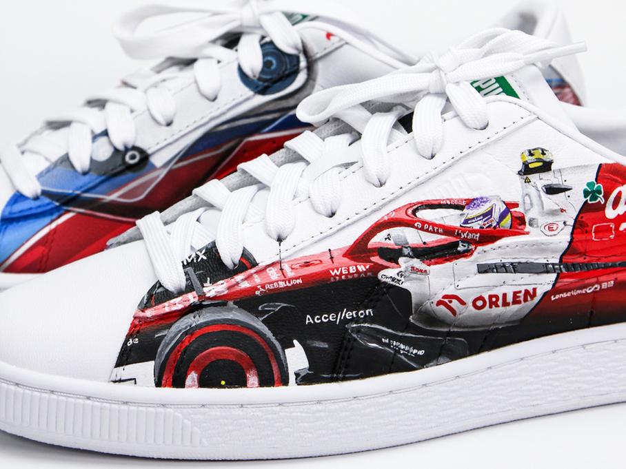 Также в рисунках можно найти отсылки к гоночным шлемам пилотов коллектива — финна Валттери Боттаса и китайца Чжоу Гуаньюя. За основу были взяты кроссовки Puma Basket Classic XXI размера 41, но вряд ли покупатель будет использовать обувь по прямому её назначению.