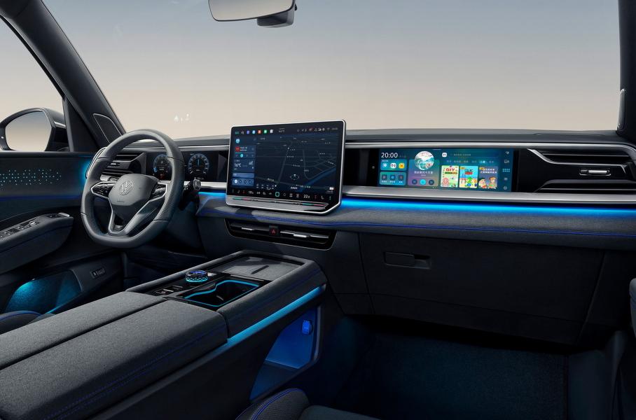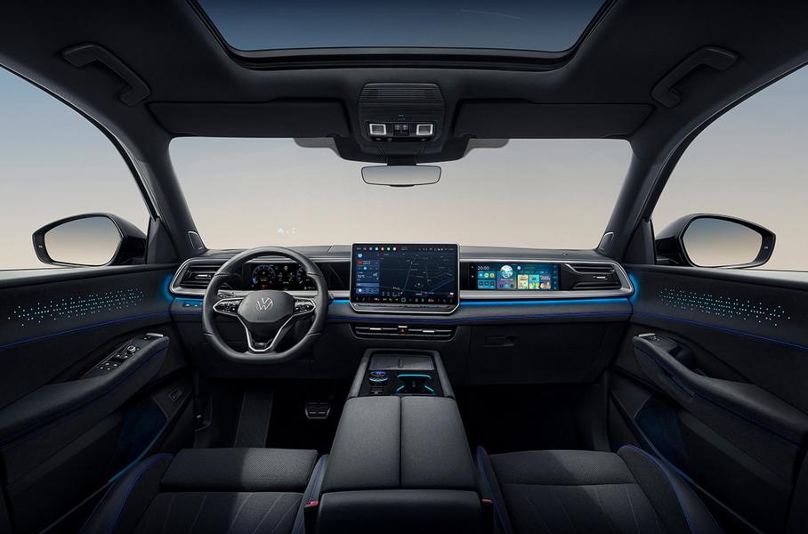 Интерьер нарочито цифровой: отказались даже от привычных ручек открывания дверей, заменив их кнопками! На передней панели три экрана, как у «младших» моделей Volkswagen для Китая, дверные карты пронизаны светящимися нитями. В топ-версии есть девять подушек безопасности, трёхзонный климат-контроль, аудиосистема Harman/Kardon с 14 динамиками, панорамная крыша и проекционный дисплей.