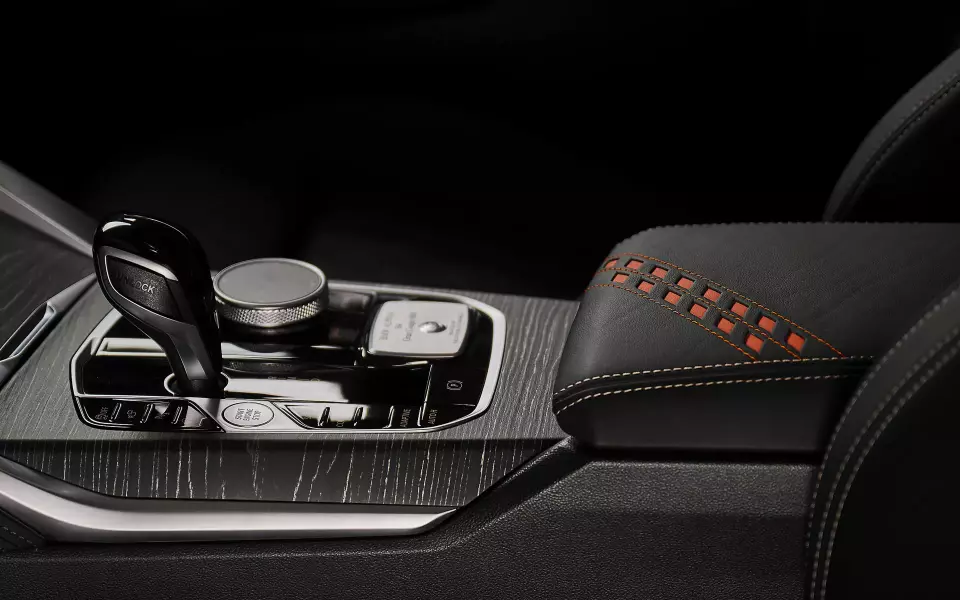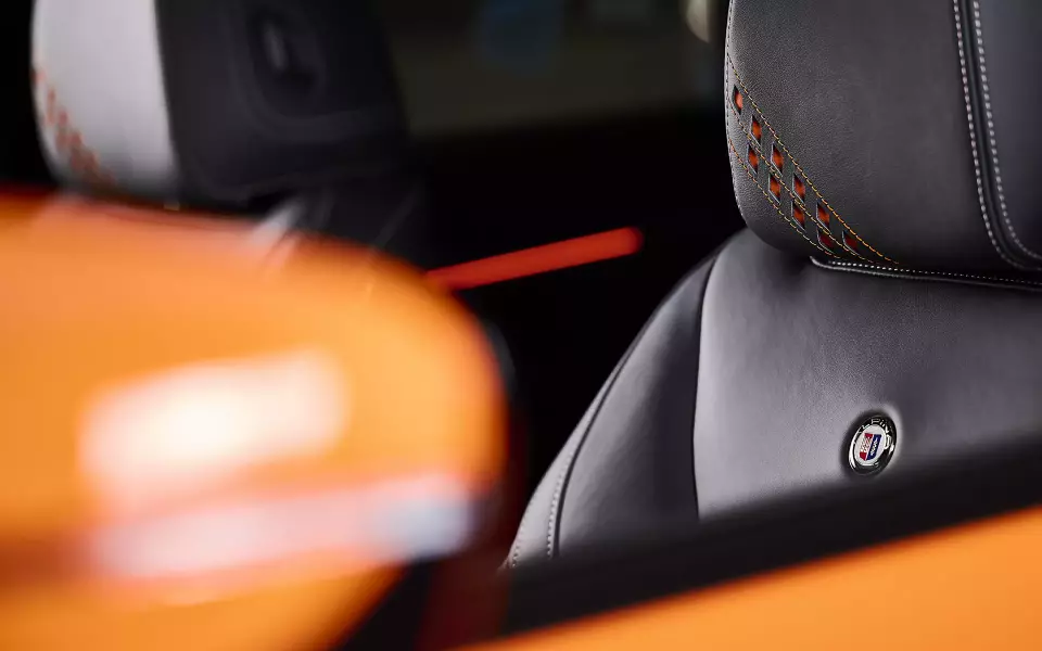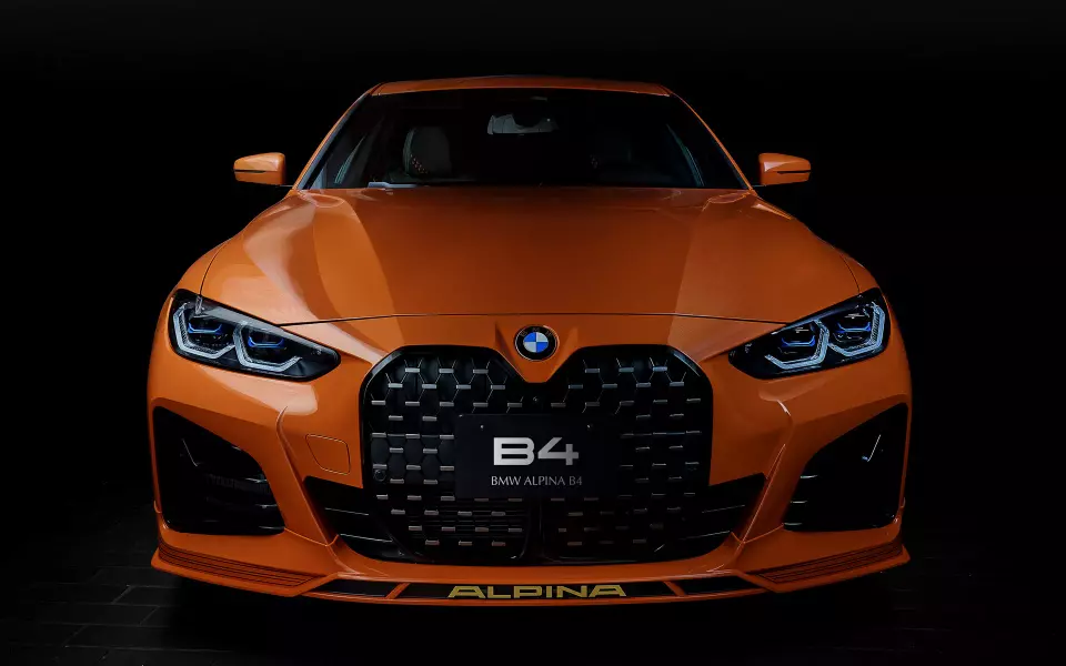 Оранжевая Alpina B4 Gran Coupe имеет золотистые акценты в декоре кузова, а в салоне, где доминируют чёрные кожа и алькантара, для большего эффекта использованы точечные акценты оранжевого цвета.
