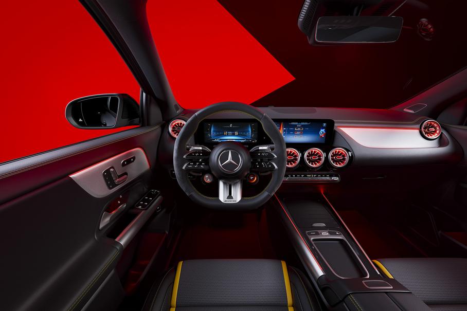 Кроссоверу доработали мультимедийную систему к 2024 модельному годуНа дороге обновленный Mercedes-AMG GLA 45 S 4Matic+ можно узнать по логотипу AMG, который «переехал» на капот, и чуть другому переднему бамперу с иными воздухосборниками. Изменилась и форма радиаторной решетки, при этом ее наполнение менять не стали. Заявлены 20- и 21-дюймовые колесные диски и красные тормозные суппорты, а также отделка салона искусственной кожей Artico с микрофиброй Microcut в коричневом цвете. Возможность выбрать натуральную кожу осталась.