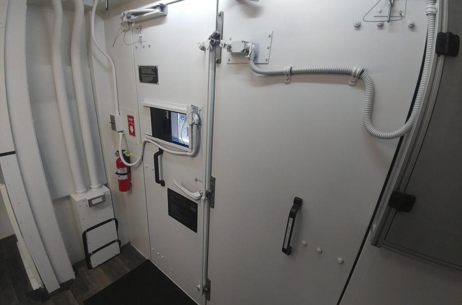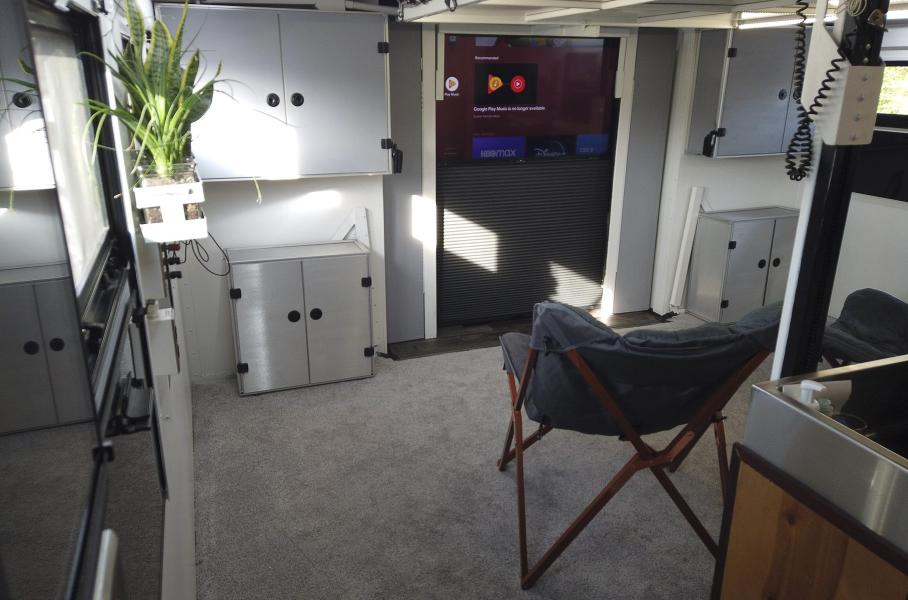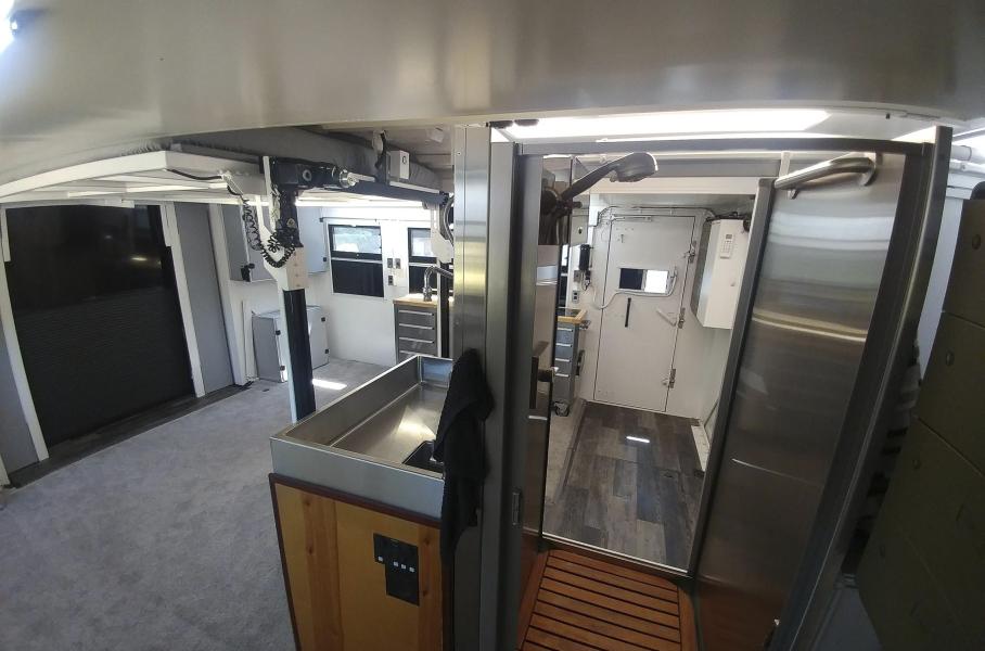 Внутри жилого модуля, получившего дополнительную звукоизоляцию, уместились душевая кабина из нержавеющей стали, кухонная зона с плитой, холодильником и морозильной камерой, а также полноразмерный матрас с лифтовым механизмом, который можно поднять под потолок для экономии места.