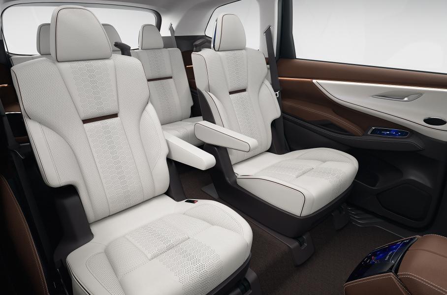 Еще одна интересная деталь — большой тачскрин на передней панели, объединяющий дисплей мультимедийного комплекса с блоком управления климатической системой. Интерьер отделан кожей в двух цветах.