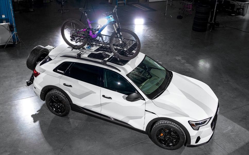 Оформлен электрический кроссовер в стиле лифтбека Блока — основной белый цвет кузова дополнен геометрическим узором серых оттенков. Стандартные колёса уступили место чёрным дискам Rotiform KB1 с внедорожными покрышками Toyo Open Country A/T III.