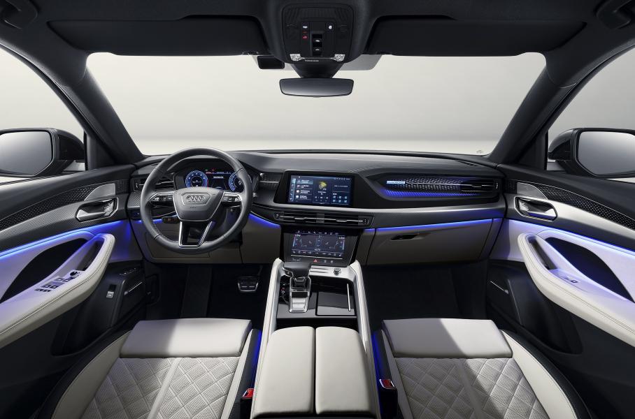 В списке оснащения Q6 — 20-дюймовые колесные диски и рейлинги на крыше, система слежения за усталостью водителя, датчики света и дождя, камеры кругового обзора и круиз-контроль.