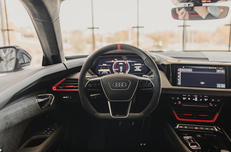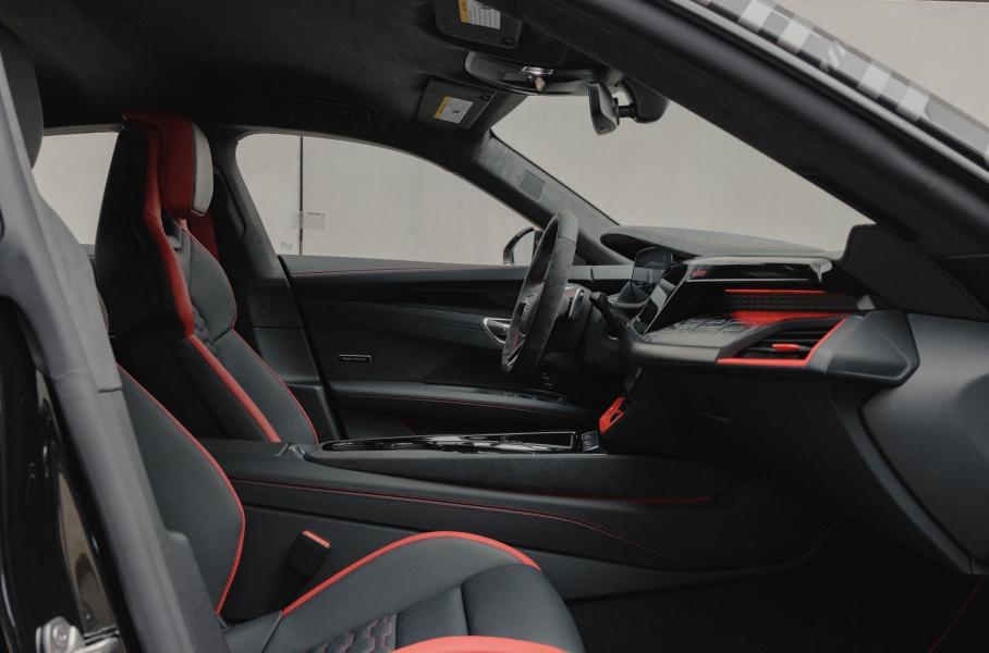 Надписи «project_513/2» можно найти на центральном подлокотнике и на экране мультимедиа. Сиденья уникального RS e-tron GT отделаны кожей «наппа», потолок — микрофиброй Dinamica. Стандартное оснащение включает матричные фары с лазерным дальним светом, углепластиковую крышу, подруливающие задние колеса и электромеханический усилитель руля Power Steering Plus с переменным передаточным отношением.