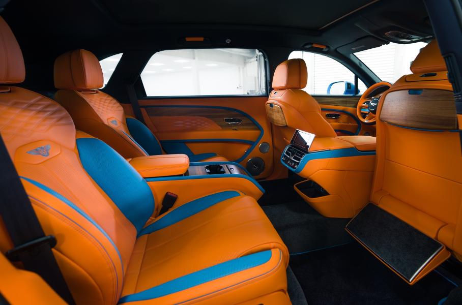 В оснащение уникальной «Бентайги» вошла тонировка задней полусферы, колеса диаметром 22 дюйма в цветах Kingfisher/Beluga и пакет Touring с системой ночного видения, адаптивным круиз-контролем и «проекцией». Салон у машины четырехместный. Сзади стоят суперкомфортные кресла Airline Seat, которые, как и другие элементы интерьера, обтянуты кожей Mandarin с акцентами Kingfisher. Также для отделки использована кожа темно-синего оттенка Imperial Blue и декоративные вставки из акации коа. Финальные штрихи — запираемый бокс для ценностей и напольные коврики с мандариновой микрострочкой и синей окантовкой.