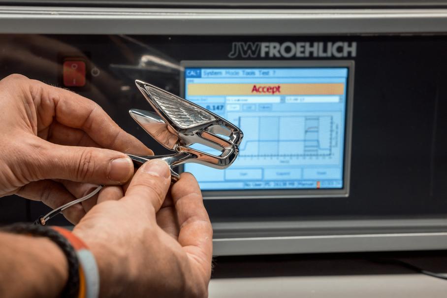 В пресс-форму впрыскивается расплавленный воск — водорастворимая часть занимает ту полость, в которой будут располагаться два крыла из акрила, а керамическая центральная часть формирует в восковой отливке канал для проводки подсветки. Затем восковая эмблема покрывается несколькими слоями тонкого керамического раствора, содержащего коллоидный кремнезем и оксид алюминия. После отвердевания этих слоёв воск расплавляется в паровой камере высокого давления, чтобы получить керамическую форму с полой полостью в виде эмблемы.