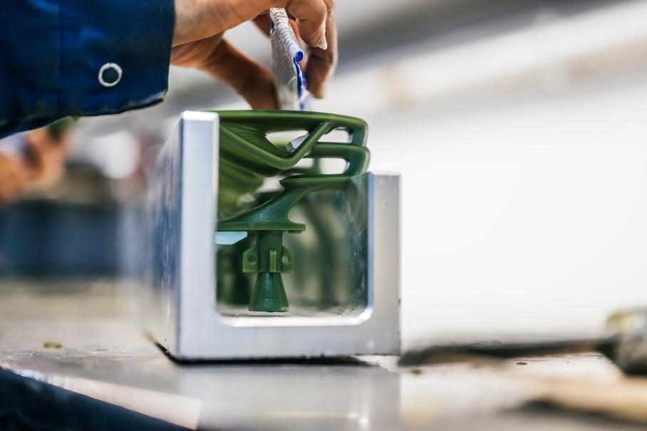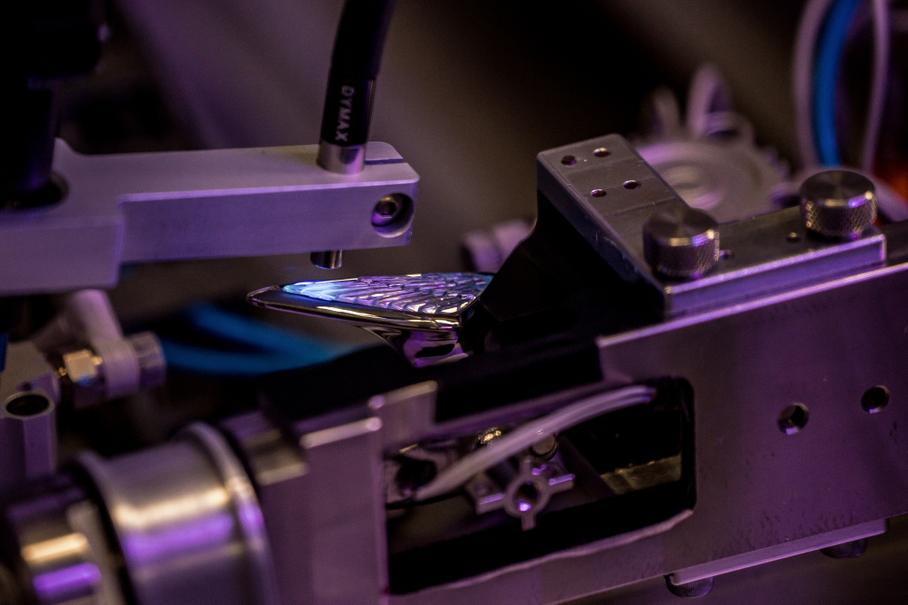 В этот момент расплавленную нержавеющую сталь 316, нагретую до 1600 градусов Цельсия, заливают в керамическую форму. После того, как сталь остынет и затвердеет, наружная керамическая оболочка удаляется, а керамический стержень растворяется щелочным раствором под давлением. Появляющаяся эмблема из нержавеющей стали в виде летящей буквы «B» готова к следующему этапу — дробеструйная обработка удаляет любые мельчайшие следы керамического материала.