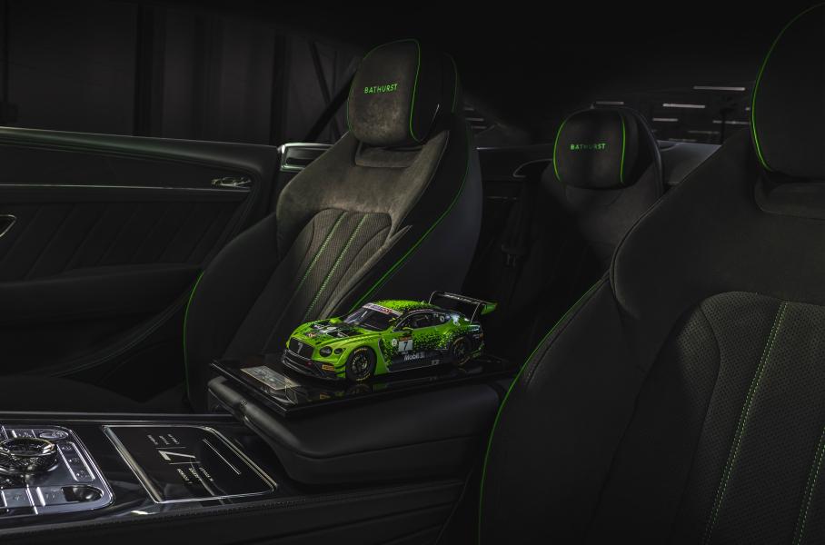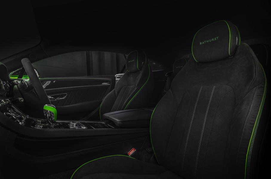Первая двухдверка окрашена в зеленый колер Apple Green, близкий к цвету ливреи Continental GT3. На контрасте играют крыша, корпуса боковых зеркал и обвес по нижнему периметру кузова в черном Beluga (пакеты Blackline и Styling Specification). Цифра «семь» на решетке радиатора — дань уважения машине-победительнице Bathurst 12 Hour. Для отделки салона взяты микрофибра Dinamica и черная кожа. Из интересных деталей — вышивки Bathurst на подголовниках и схематическое изображение трассы на передней панели со стороны пассажира.