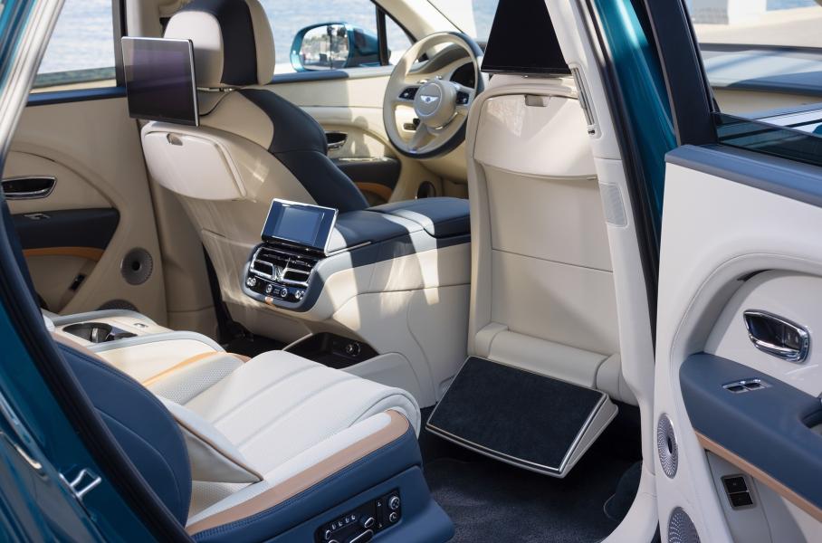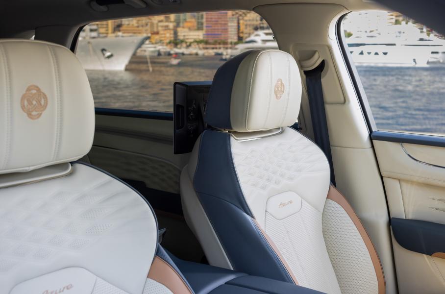 Сидения в Bentayga EWB Azure Riviera Collection обиты комбинацией бежевой кожи Linen, синей Brunel и рыжеватой Autumn. От Mulliner здесь коврики с глубоким ворсом и микрострочкой, а также подушки. Стандартно кроссовер оснащен колесами диаметром 22 дюйма, пакетом Blackline Specification (черный глянцевый внешний декор), суперкомфортабельными креслами Airline Seat Specification, акустикой Bang & Olufsen и развлекательной системой для задних пассажиров.