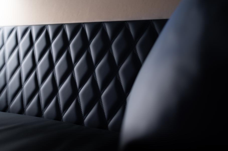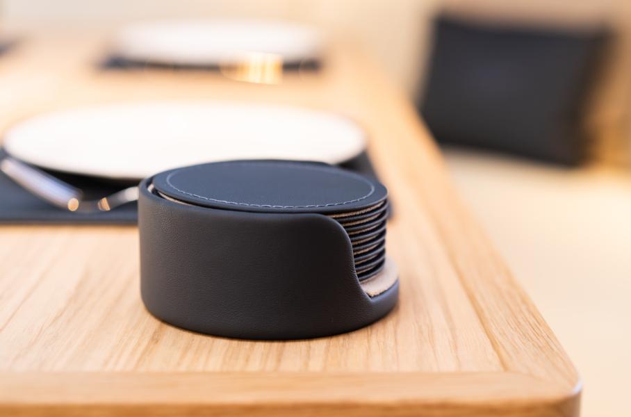Во время работы над яхтой Bentley активно использовала современные методы макетирования, включая 3D-печать. Чтобы убедиться в качестве отделки, некоторые предметы сначала изготавливали в виде моделей, в том числе полноразмерных. Так был сделан угловой диван, который затем обшили кожей с фирменной ромбовидной прострочкой. Вообще, материалы тут такие же, как в автомобилях. Ну а мебель, понятное дело, из коллекции Bentley Home (в том числе стулья Malvern). Кое-что правда пришлось создать по индивидуальному проекту — это бар, тумба для умывальника, лоток для салфеток и подставки под кружки.