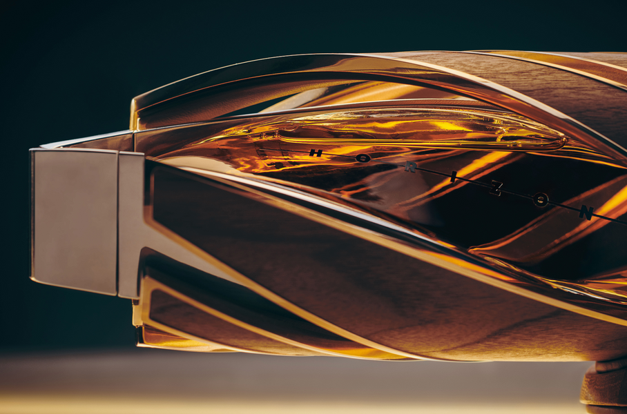 Над напитком работала шотландская винокурня MacallanСтеклянную бутылку обрамляет алюминиевая структура, а ее — вырезанная на заказ «скульптура» из шпона ореха Bentley Crown Cut. Она обтянута искусно обработанной коричневой кожей с рамкой из меди. Часть использованной меди — это переплавленные перегонные кубы, которые раньше использовались в Macallan.
