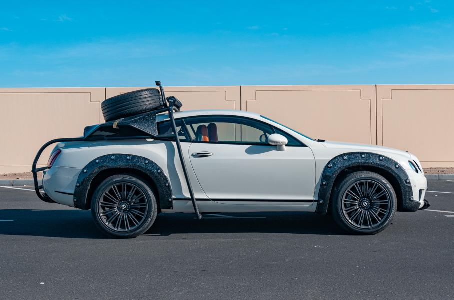 Интересно, что двухдверка Bentley с внедорожным потенциалом обута в шоссейные покрышки Pirelli. Сомнительна целесообразность трубчатых усилителей, которые опоясывают заднюю часть кузова. Наконец, расширители колёсных арок, стилизованные под углеродное волокно, выглядят топорно, а стальная поперечина спереди вряд ли защитит бампер.