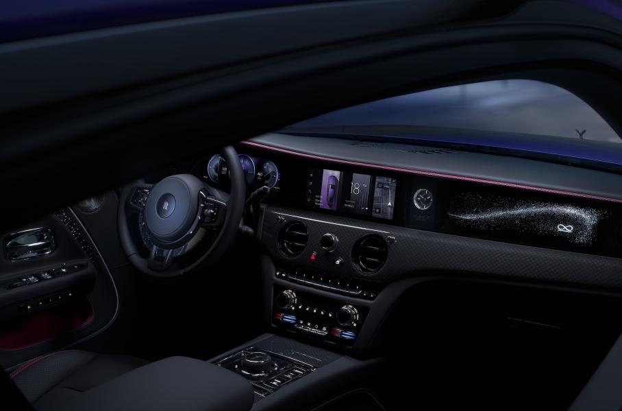 Кроме того, капот Black Badge Spectre впервые можно окрасить в «морозный черный» Iced Black, нанести на нижнюю часть кузова дополнительную акцентную линию coachline и выбрать один из пяти вариантов подсветки решетки радиатора. Салон электрокара украшает вставка на передней панели с 5500 звездами и символом бесконечности, под ней — накладка с декором Technical Fibre из углеволокна и металлических нитей на деревянной подложке, покрытых шестью слоями лака и отполированных. Наконец, накладки на пороги представлены с подвеской в десяти комплиментарных цветах, которые выступают дополнением к внешней иллюминации.