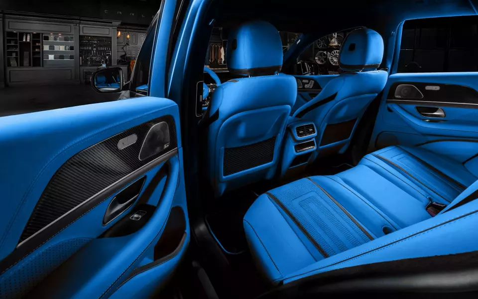 Но зато радикально меняет интерьер! Весь салон немецкого кроссовера был перетянут ярко-синей кожей Blue Racing. Единственное исключение — вставка из углеродного волокна на приборной панели и акценты из чёрной кожи.