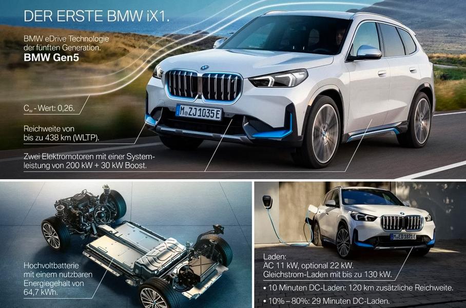 Фотографии кроссовера слили в Сеть за день до премьерыИз слитых слайдов следует, что электрический BMW X1 получит двухмоторную установку мощностью 272 лошадиные силы, причем отдачу можно кратковременно увеличить до 313 сил. На одном заряде батареи емкостью 64,7 киловатт-часа кроссовер будет проезжать 438 километров, а пополнить запас энергии с 10 до 80 процентов можно от станции быстрой зарядки менее чем за полчаса. Что касается внешних отличий электрического X1 от обычного, то они сводятся к синим вставкам на кузове.