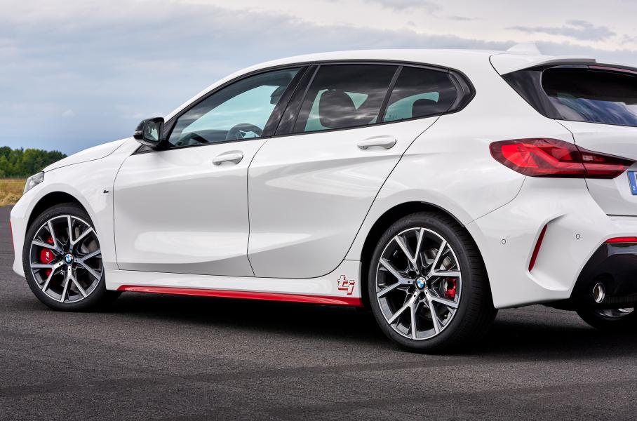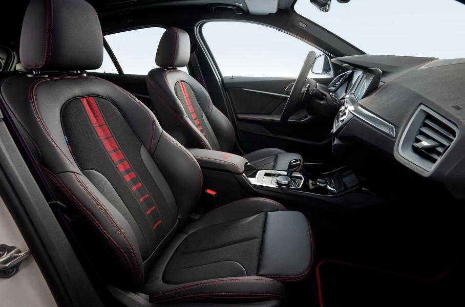 Визуально отличить BMW 128ti от других модификаций с пакетом M Sport можно по ярким акцентам на переднем бампере и порогах, плюс декору Extended Shadowline с черными элементами (входит в базовое оснащение машине для рынка Германии), стандартным 18-дюймовым колесам, которые без доплаты можно «обуть» в цепкие шины Michelin Pilot Sport 4, и 90-миллиметровым насадкам на выхлопные патрубки. В салоне из новшество — комбинированная обивка из искусственной кожи Sensatec и ткани, красные акценты и просрочка, а также аксессуары M: ремни безопасности, накладки на педали и пороги.