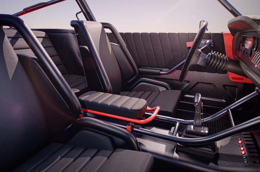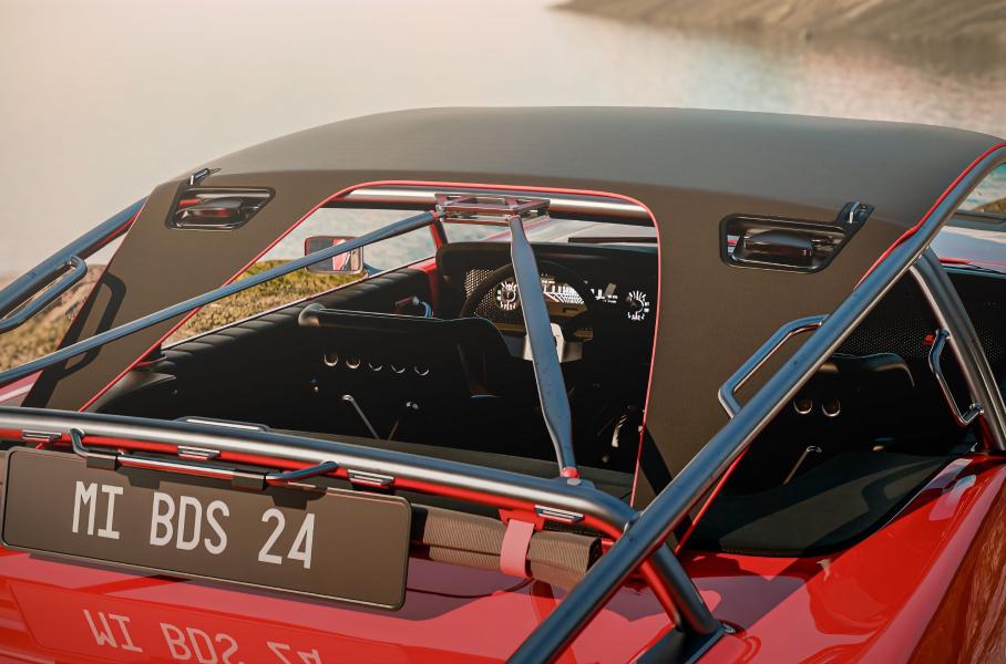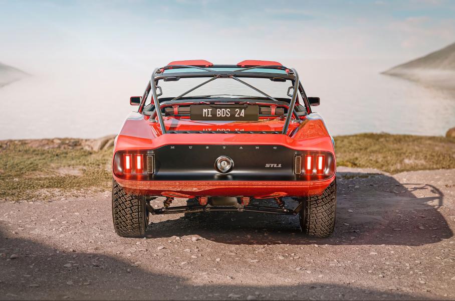 Сам Борромео называет машину Fastback Mustang Safari. У неё новый кузов из низкоуглеродистой легированной кремнием стали, подвески на усиленных трубчатых рычагах и массивные тормозные механизмы с алюминиевыми суппортами, причем задние установлены вне колес, как на Alfa Romeo SZ. Для улучшения геометрической проходимости заужены боковины и укорочены свесы, но самая занимательная деталь — патрубки выхлопной системы, интегрированные в канонические трехсегментные фонари. Выставленный напоказ каркас безопасности и заново спроектированный салон с цифровой «приборкой» идут приложением к новому образу.