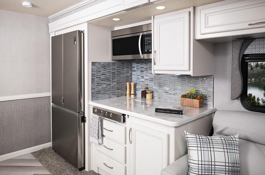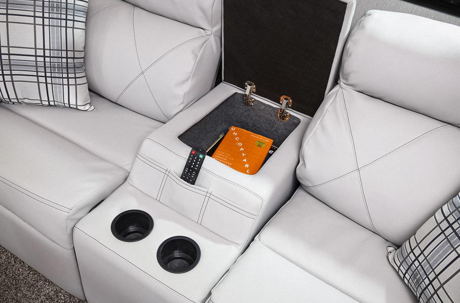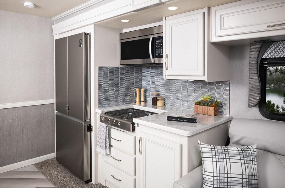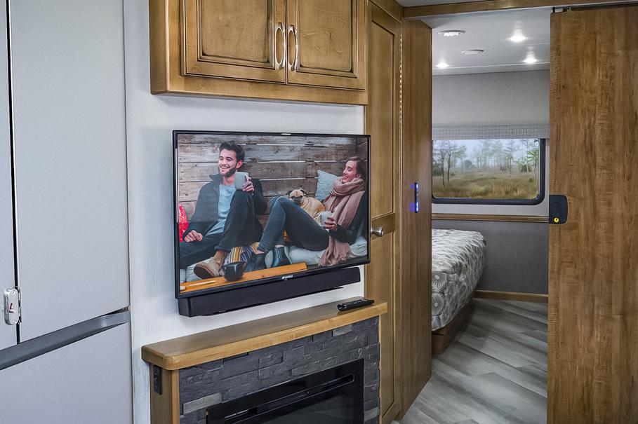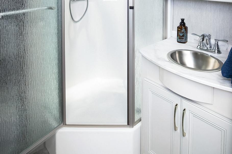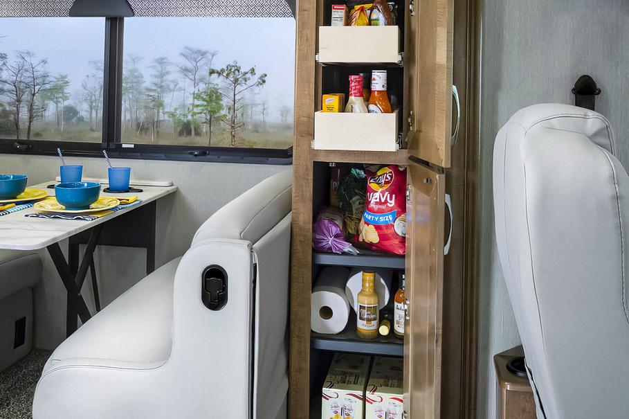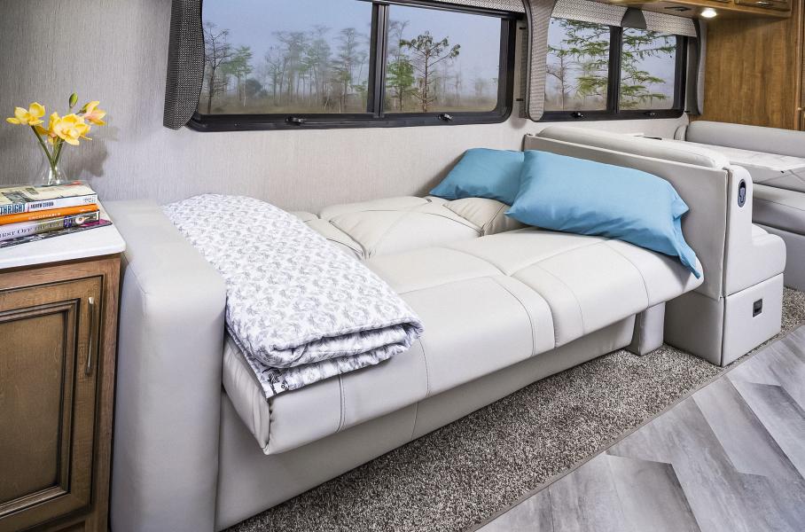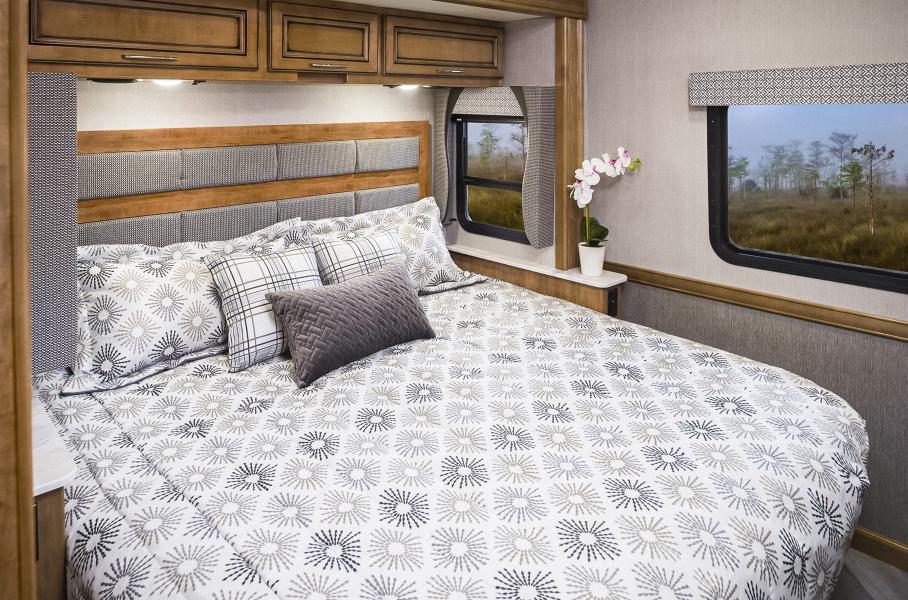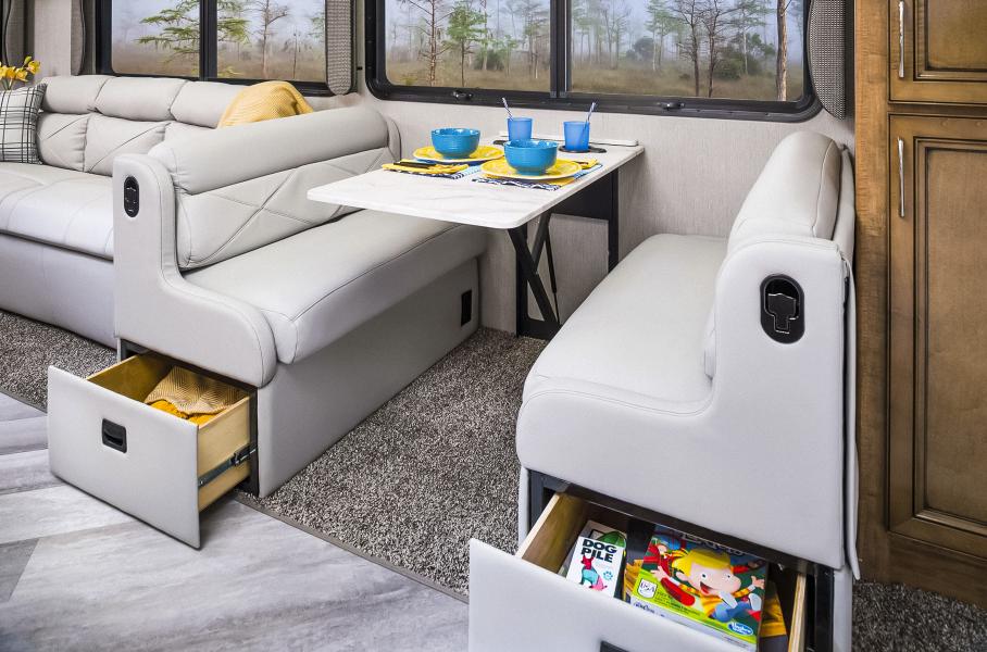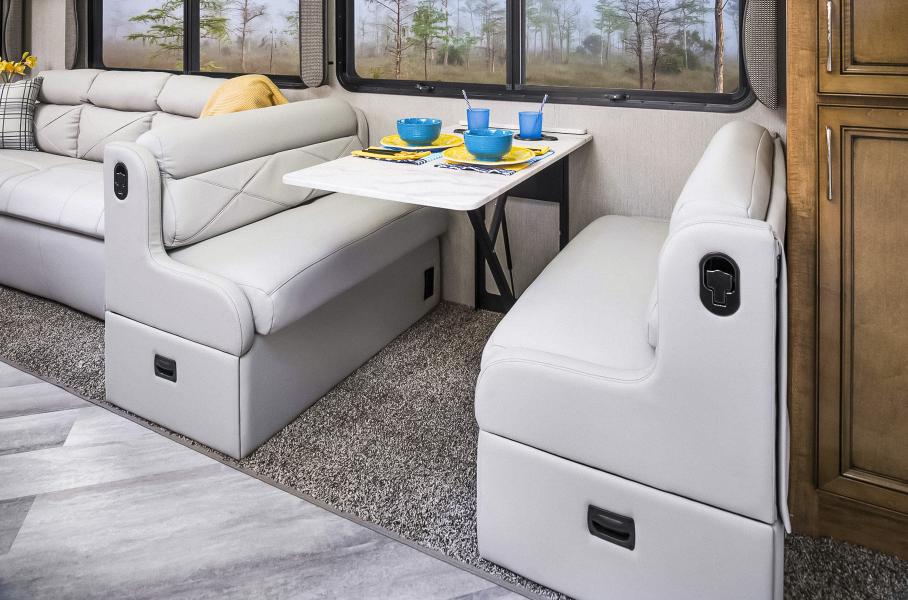Разработчики нового поколения дома на колесах сделали ставку на удобство эксплуатацииВнутреннее пространство Bounder 35GL продумано до мелочей. Автодом оснащен комфортным жилым модулем, в котором разместили спальное отделение с двухместной кроватью, телевизором и ящиками для хранения вещей, гостиную с диваном и раскладывающимися креслами, а также «умную» обеденною зону «Adap-table» со столешницей, раковиной, холодильником и плитой, которую можно превратить в барную стойку на четырех человек. В ванной комнате специалисты установили полноценный санузел с туалетом и раковиной.
