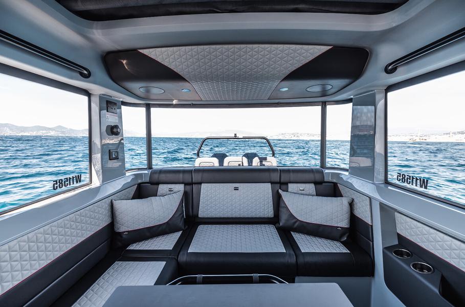 Катер рассчитан на 10—12 пассажиров. Рубка оснащена сдвижными дверями и мягкой складной крышей. В передней каюте установлена двухспальная кровать. Для отделки используются углеволокно и дорогая кожа с прострочкой «в ромбик». Пост управления оборудован двухэкранной сенсорной панелью Simrad — на неё выведены настройки навигации, мультимедиа и ассистирующих систем. Ещё два дисплея есть со стороны пассажира. Они показывают текущую скорость и время на цифровых часах Panerai.