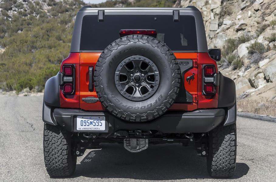 Bronco Raptor был представлен в январе 2022 года. Он оснащается трехлитровым V6 EcoBoost от Explorer ST и Lincoln Aviator, который выдает 424 лошадиные силы и 597 Нм крутящего момента. ДВС работает в паре с десятидиапазонным автоматом и полным приводом с блокировками межколесных дифференциалов.