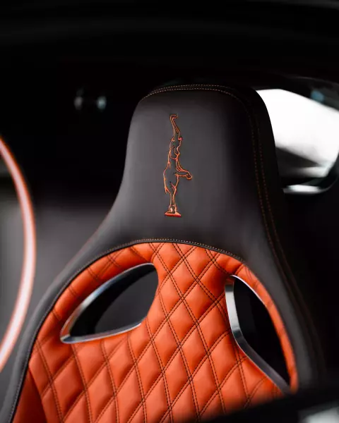 В салоне доминирует дорогая кожа цвета Tangerine, которую дополняют детали из полированного алюминия и карбона. Особенностью дверных панелей стала плетёная кожа, составленная из тонких кожаных полосок. Декорирован салон вышитыми изображениями знаковой для марки скульптуры Рембрандта Бугатти в виде стоящего на задних лапах слона.