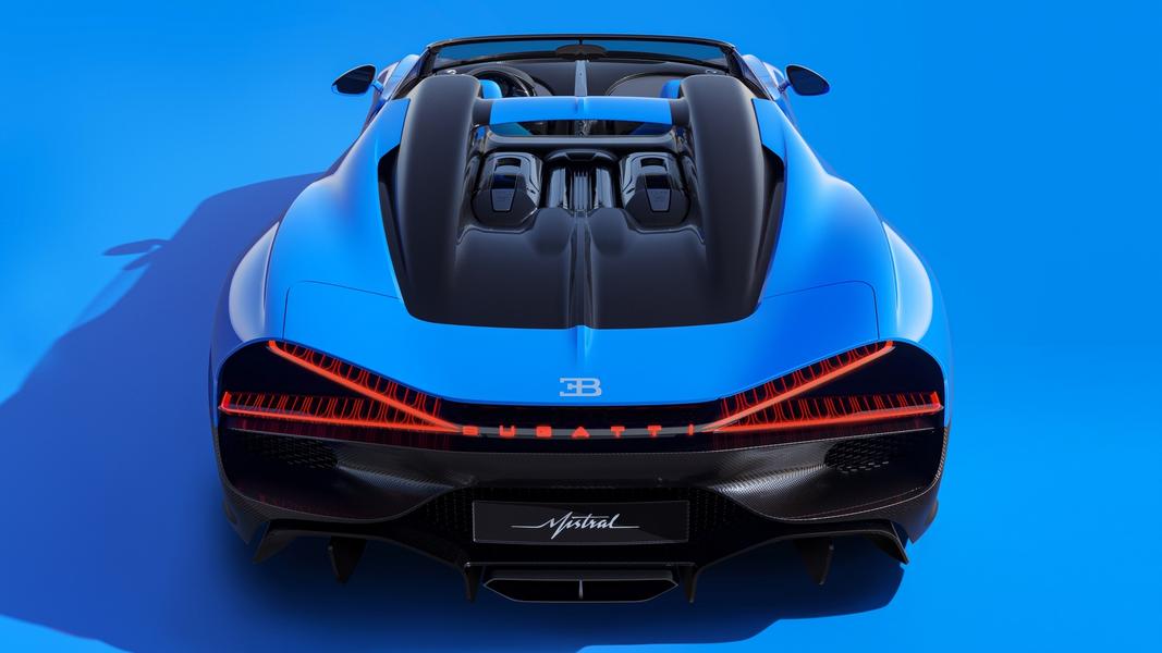 Автомобиль, названный в честь мистраля — мощного ветра, который дует из долины реки Роны, через шикарные города Лазурного берега на юге Франции и в Средиземное море — оснащён 8-литровым W16 с четырьмя турбинами. Версия мотора, получившая название Thor, развивающая 1600 лошадиных сил и 1600 Нм крутящего момента, ранее использовалась на Chiron Super Sport 300+ и Centodieci. По заявлению марки, двигатель поможет W16 Mistral добиться цели стать самым быстрым родстером в мире. Тираж гиперкара составит всего 99 экземпляров по цене от 5 000 000 евро, а поставки клиентам должны начаться в 2024 году. Все машины уже распроданы.
