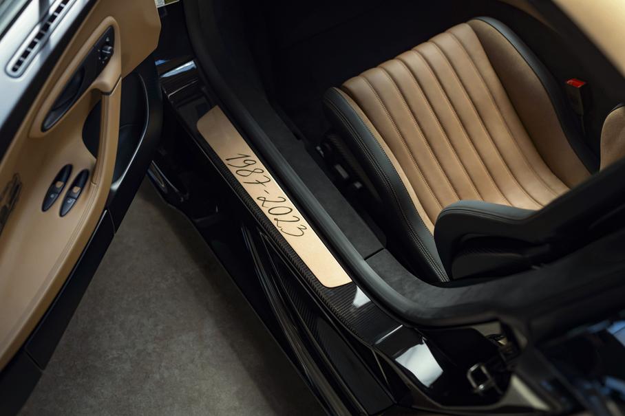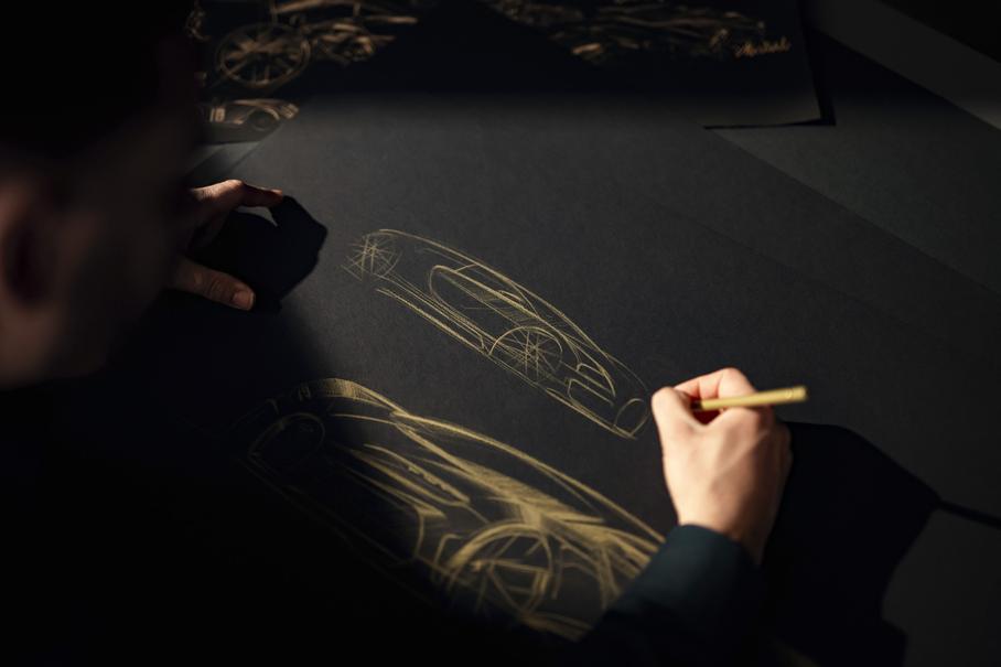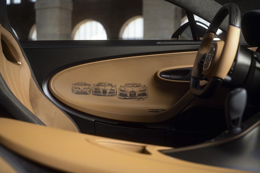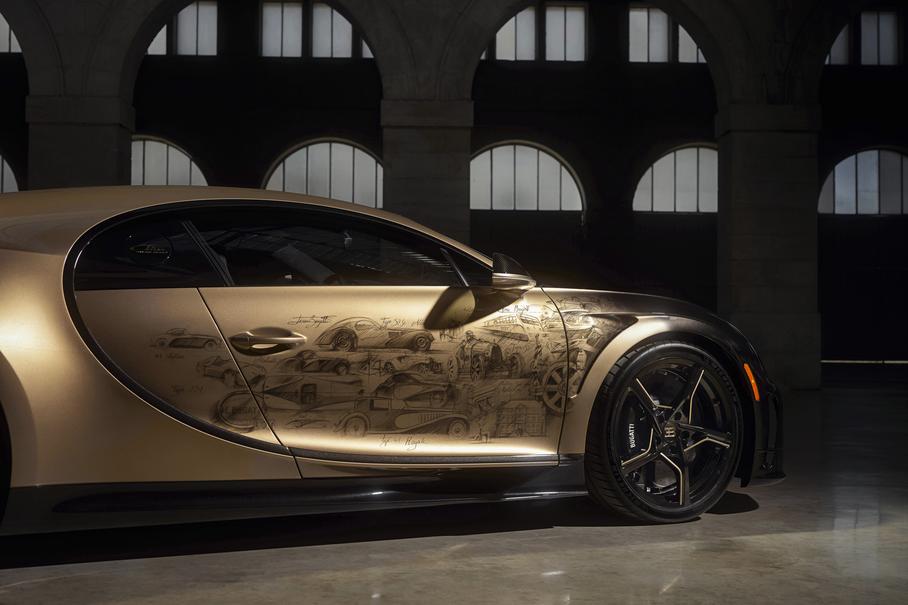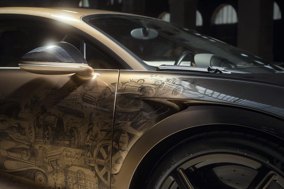 На создание гиперкара ушло два года, а на эскизы от руки — 400 часовКузов гиперкара окрашен в два цвета: черный Nocturne Black и разработанный специально для этой модели золотистый оттенок Doré (очевидно, в честь сплава золота и серебра, который так и называется: сплав доре). Со стороны пассажира снаружи нанесены 26 эскизов исторических моделей, включая Type 41 Royale и Type 57 SC Atlantic, а со стороны водителя — 19 эскизов с автомобилями новой эпохи, начавшейся в 1987 году. Там в том числе изображены EB110, Veyron и Chiron.