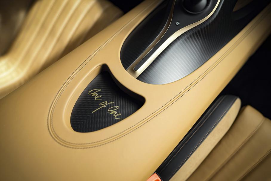 Художественное оформление распространяется и на салон. На каждой дверной панели вручную нарисованы три Bugatti: EB110, Veyron и Chiron с одной стороны и Type 35, Type 57 SC Atlantic и Type 41 Royale с другой. Также в салоне присутствует тонкая прострочка Golden Era и написанная от руки надпись «One-of-One».