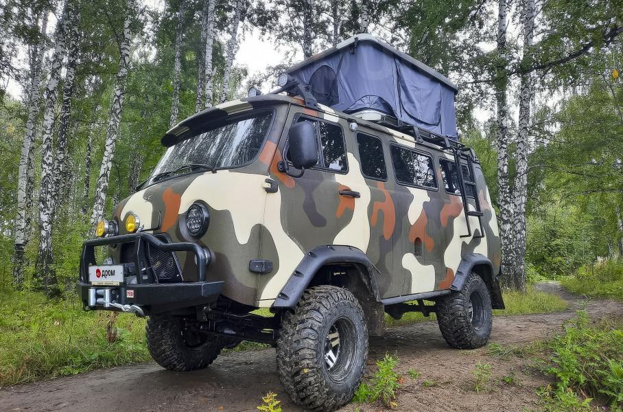 Базовый микроавтобус стоит более чем в два раза дешевле«Приключенческое» исполнение «Буханки» получило, помимо камуфляжа, шумоизоляцию салона, расширители колесных арок, подножки, тонировку стекол и антикоррозионную обработку кузова. На крыше расположили багажник с палаткой, на боковине разместили лестницу. Оптика заменена, добавлены «противотуманки», на крыше и спереди установлена дополнительная светотехника.
