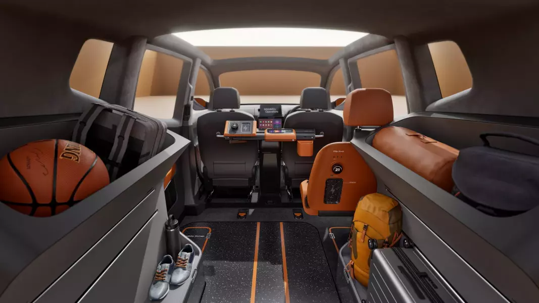 Пассажир в салоне имеет доступ к информационно-развлекательному дисплею, элементам управления отоплением и кондиционером, а также настраиваемой панели с портами для зарядки, крючками для одежды или сумок, подстаканниками и ящиками для хранения вещей. Кроме того, единственное заднее пассажирское сиденье можно опустить, превратив в лоток с дополнительными возможностями для зарядки электронных устройств.