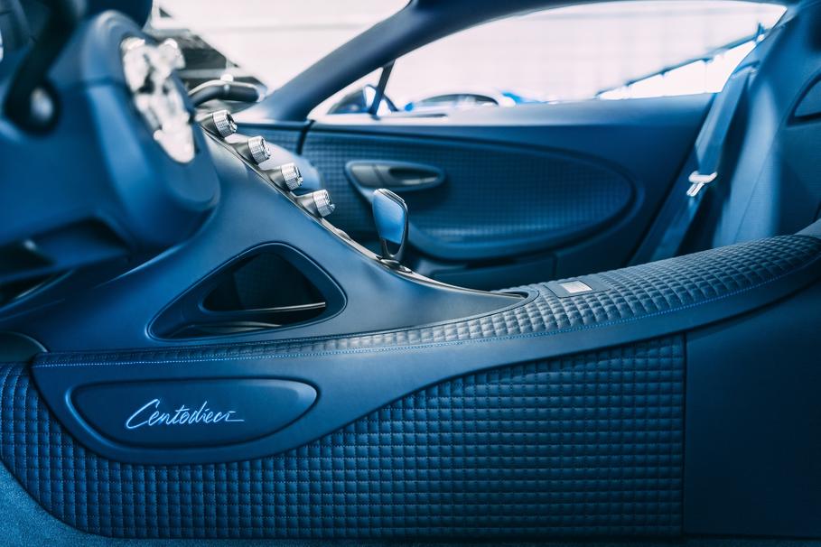 Проблему при создании ровного рисунка составляют разная кривизна и радиусы отдельных панелей, которые должны создавать ровный рисунок. На панелях порогов и подлокотнике размещаются алюминиевые значки с тонкой лазерной гравировкой Centodieci. На сборку внутренней отделки одного Bugatti уходит не менее 16 недель ручной работы.