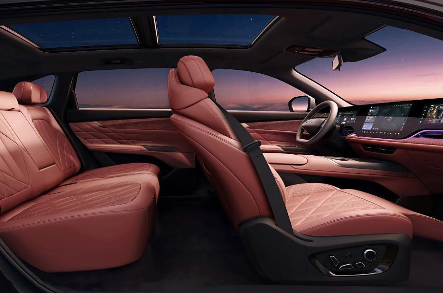 Ручки дверей встроены в подлокотники, как на Exeed RX. Под тройным экраном протянута полоса подсветки, а сиденья обиты перфорированной кожей.
