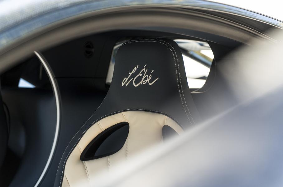 Тираж спецверсии — всего три экземпляраИзгибы темно-синего карбонового кузова Chiron L'Ébé подчеркнуты золотыми линиями, которые перекликаются с оформлением колесных дисков и шильдиками Bugatti. В том же оттенке выполнены обводка фирменной радиаторной решеткой в форме подковы, а также детали крышки восьмилитрового W16. На нижней стороне антикрыла спрятано название версии курсивом — L'Ébé, им также отмечены пороги и расшитые вручную спинки сидений.