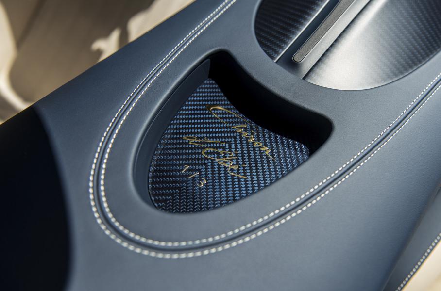 Салон выполнен в более светлой сине-голубой гамме и лишен золотых акцентов. Передние двери оформлены в разных цветовых схемах: на водительской преобладает светлая натуральная кожа оттенка Silk, а на пассажирской — напротив, темная Lake Blue. Любопытная деталь — изображения самых знаковых автомобилей Bugatti на каждой двери, от ранних гоночных моделей до современных гиперкаров.