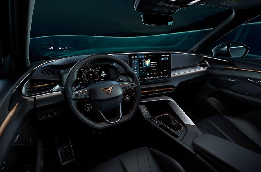 Интерьер полностью свой. Использован виртуальный щиток приборов и мультимедиа-система с экраном диагональю 12,9 дюйма. Вокруг водителя организован своего рода «кокпит» за счёт развёрнутой к нему панели приборов и высокой «распорки» на центральном тоннеле. А вот на месте традиционного селектора трансмиссии на центральном тоннеле — подстаканники и индукционные зарядки, а коробка управляется рычажком на рулевой колонке. Передние кресла — гоночного вида «ковши» с интегрированными подголовниками (они ставятся даже в базовых комплектациях). Задний диван снабжён продолной регулировкой, позволяющей менять объем багажника от 540 до 630 литров.