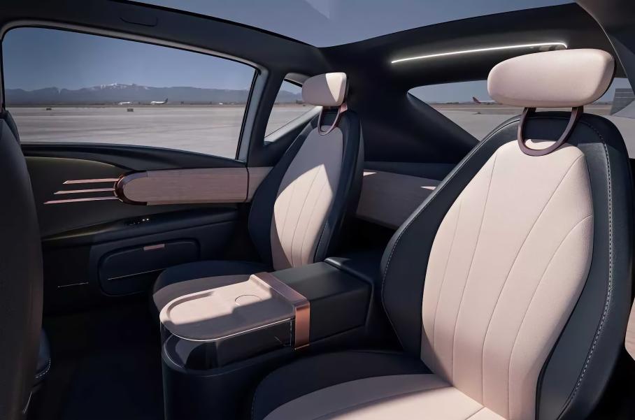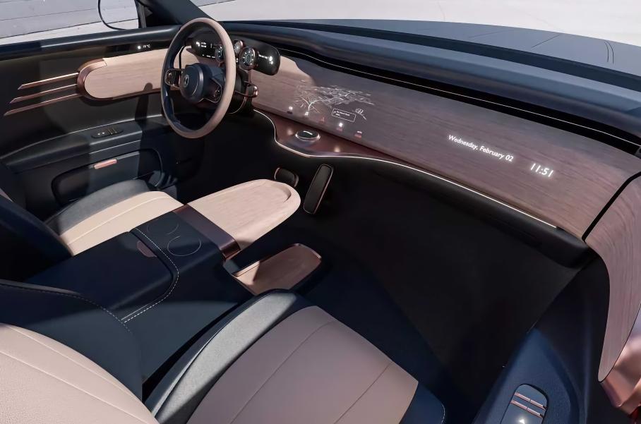 Салон обещают сделать модульным, с количеством посадочных мест от 3 до 7. Интересно, что в цифровую эпоху ставка делается на физические органы управления, но в сочетании с shy-tech. Пример — экран мультимедиа, интегрированный в деревянную обшивку. Его видно только во включенном состоянии — всё остальное время взгляд водителя и пассажира будет утыкаться в декоративную панель. Ещё один важный элемент внутреннего убранства — консоль между передними сидениями, которую при желании можно оснастить хьюмидором, кофемашиной, сейфом с биометрическим замком или превратить в садик в стиле бонсай.